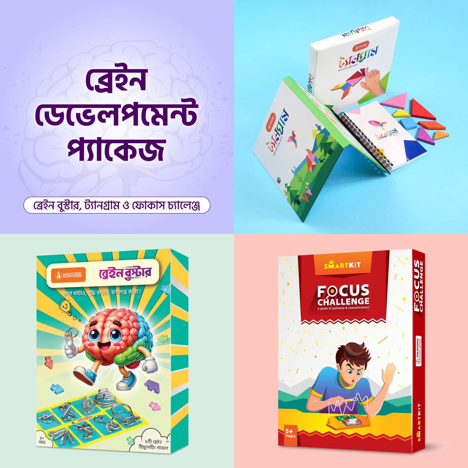 আমাদের সন্তানেরা দিনে একটা বড় সময় কাটায় ফোন, ট্যাব বা টিভির সামনে। তাদের মধ্যে বেশিরভাগই ডিজিটাল অ্যাডিকশনে আক্রান্ত। এই অ্যাডিকশনের ভয়াবহতা মারাত্মক। এতে ব্রেইনের ডেভেলপমেন্ট ক্ষতিগ্রস্ত হয় এবং ADHD এর মতো রোগে আক্রান্ত হয় তারা! এক্ষেত্রে দায়টা আমাদেরই নিতে হবে। কারণ, আমরা তো ভালো কোনো বিকল্প দিতে পারছি না তাদের! এই সমস্যার সমাধান মিলবে বিজ্ঞানবাক্সের ব্রেইন ডেভেলপমেন্ট প্যাকেজ থেকে। এই প্যাকেজে তিনটা কিট আছে। যুক্তি আর বুদ্ধি প্রয়োগ করে খেলতে হবে ব্রেইন বুস্টার, মনোযোগের পরীক্ষা হবে ফোকাস চ্যালেঞ্জে আর কল্পনাশক্তি জাগিয়ে তুলবে ট্যানগ্রাম!